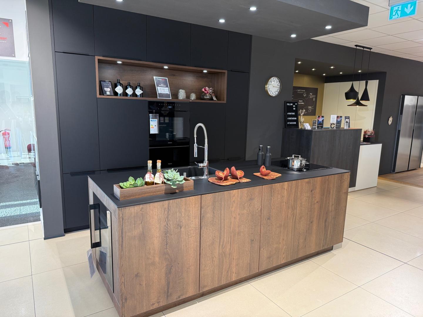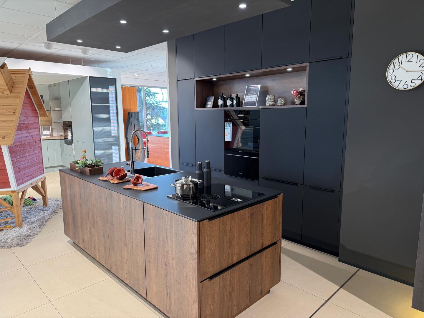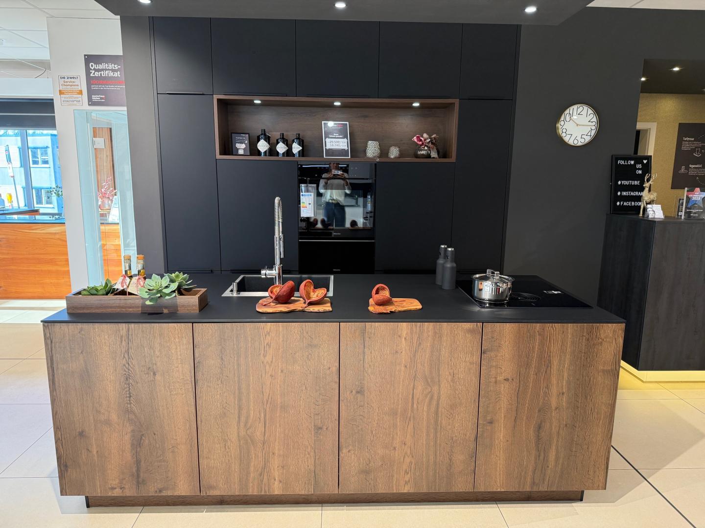 Musterküche zum Abverkauf: Entdecken Sie unsere exklusive Ausstellungsküche von 2023: Matt Schwarz Ulramatt trifft auf Eiche Cognac